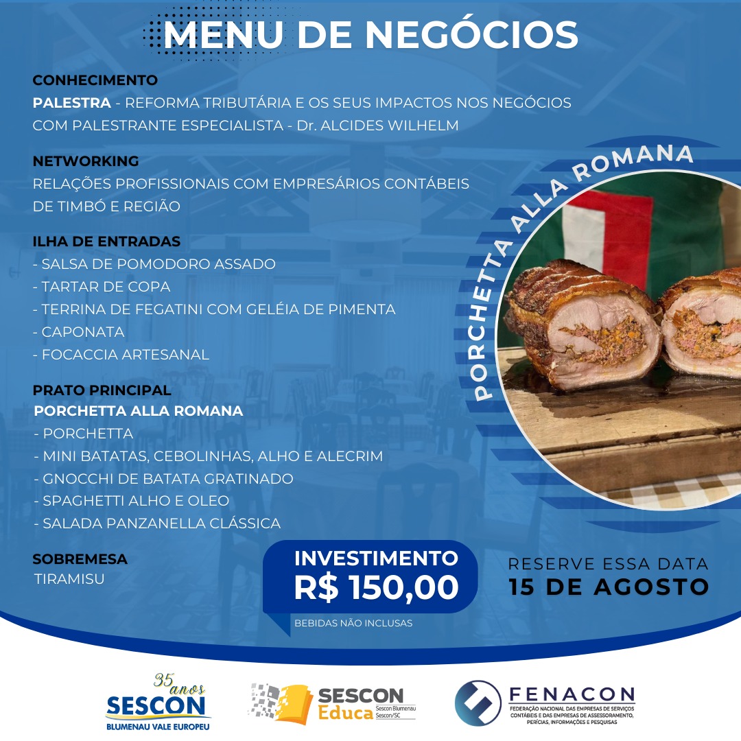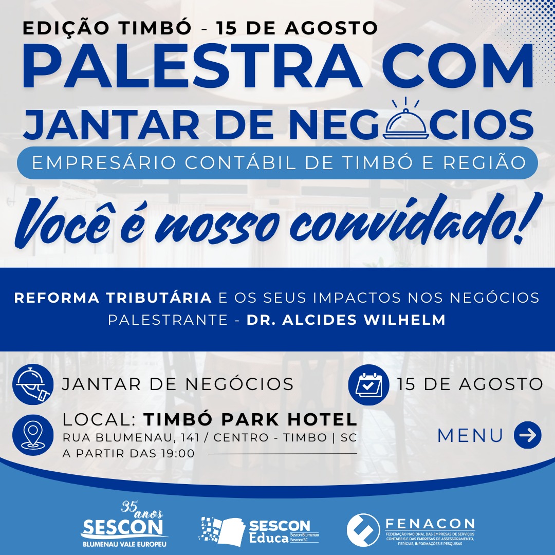 Em celebração aos seus 35 anos de atividades, o Sescon Blumenau Vale Europeu realizará no dia 15 de agosto uma palestra seguida de jantar de negócios, no Timbó Park Hotel, localizado no Centro de Timbó. O evento é voltado para empresários contábeis da região e contará com a participação do renomado Dr. Alcides Wilhelm.