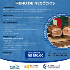 Com início às 19h, a palestra terá como tema “Reforma Tributária e seus impactos nos negócios”, abordando as principais mudanças e implicações da reforma para o setor contábil e empresarial. Dr. Alcides Wilhelm, especialista na área, trará uma análise aprofundada e esclarecedora sobre o assunto, proporcionando aos participantes informações essenciais para a adaptação e planejamento estratégico de suas empresas.