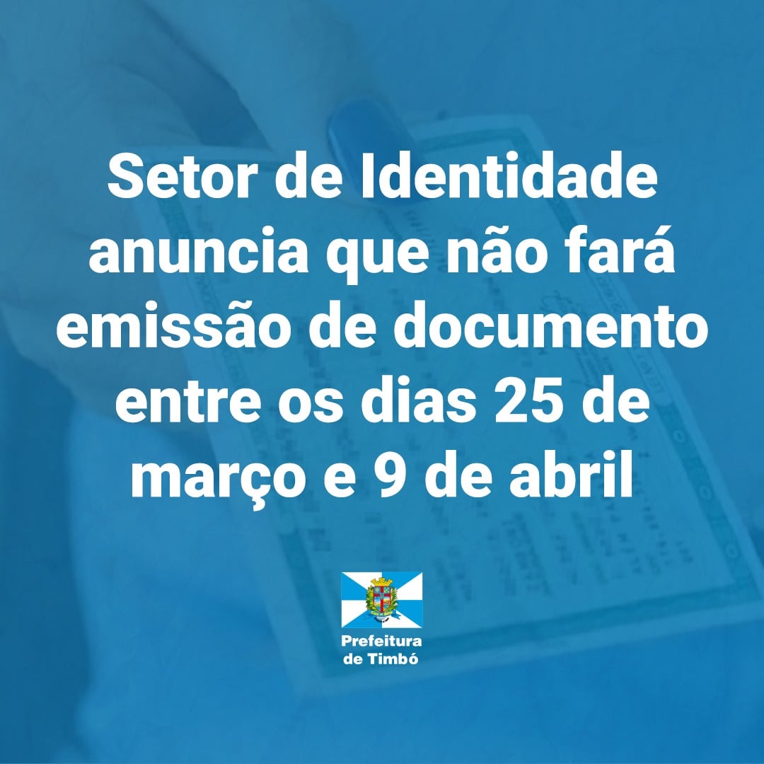O Setor de Identidade informa que não irá realizar a emissão de documentos a partir desta quinta-feira, 25 de março, até o dia 9 de abril devido à transição do sistema, sendo que nesse período os funcionários estarão passando por capacitação para a implementação do novo sistema e para melhor atender à comunidade.