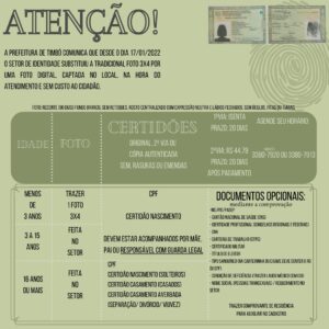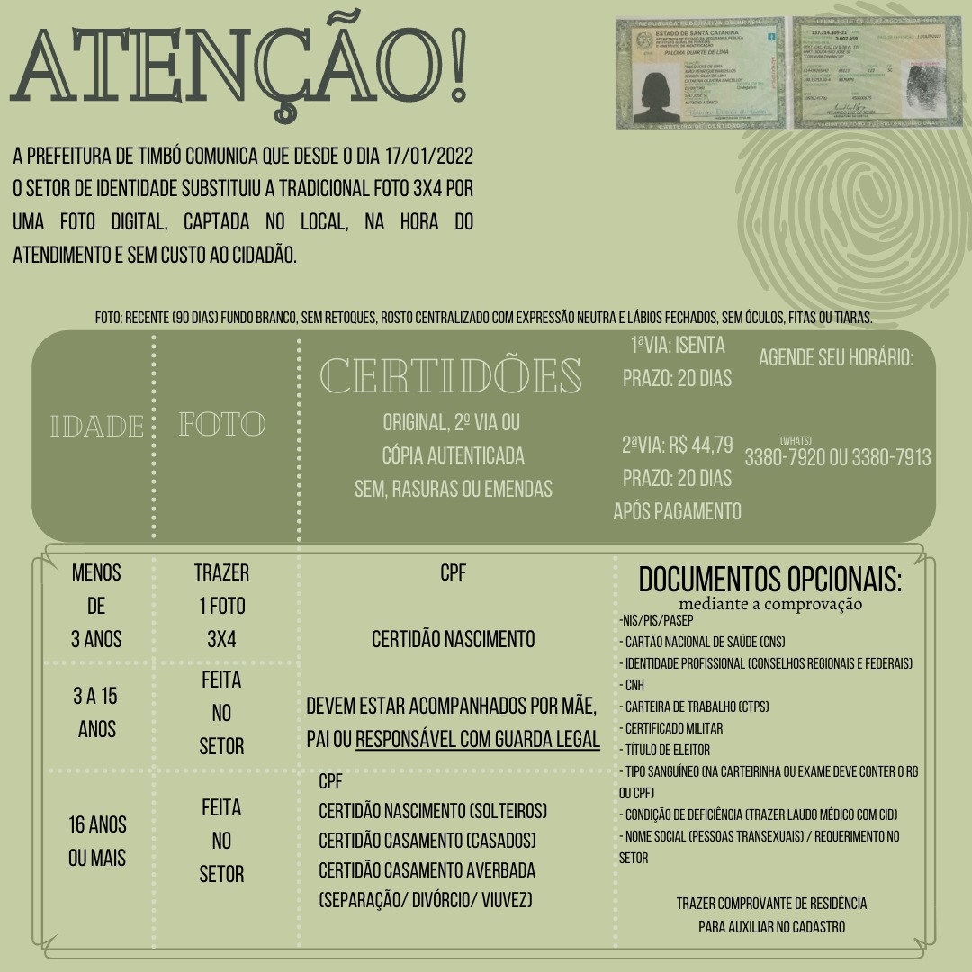 O Setor de Identidade, serviço do Governo do Estado de Santa Catarina que atende no Simplifica Timbó, informa que desde o dia 17 de janeiro substituiu a tradicional foto 3×4 por uma foto digital, captada no local, na hora do atendimento e sem custo ao cidadão.