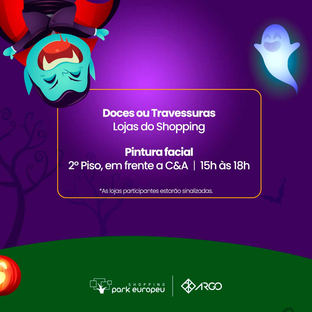 O evento acontece no Shopping Park Europeu nos dias 30 e 31 de outubro e terá pinturas faciais, doces ou travessuras e muito mais.