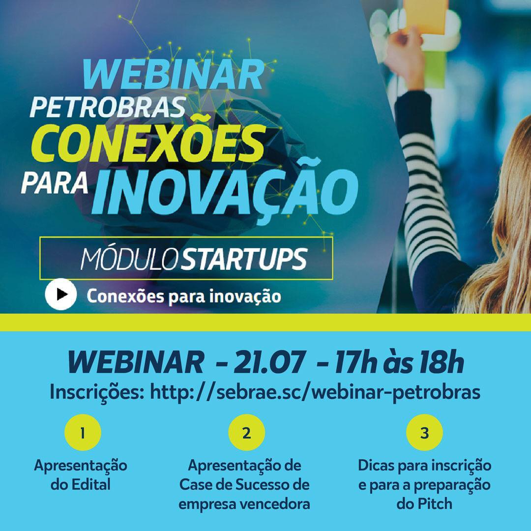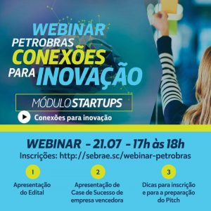 O Sebrae preparou uma série de webinars sobre o 3º edital Petrobras Conexões para Inovação – módulo startups. Representando Santa Catarina, duas startups catarinenses, a LTrace e The Insight, irão participar de um webinar com a temática sobre modelagem geológica. O evento, na próxima quarta-feira, 21 de julho, às 17h, será conduzido por Cristina Berwanger Pereira, da Gerência de Atendimento Empresarial do Sebrae/SC. As inscrições podem ser feitas pelo http://sebrae.sc/webinar-petrobras