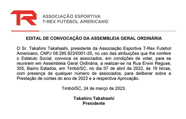 T-Rex – EDITAL DE CONVOCAÇÃO DA ASSEMBLEIA GERAL ORDINÁRIA Março 24, 2023 0 Por Redação Whatsapp Share Post Share Pinterest EDITAL ORIGINAL CLIQUE AQUI Matérias Relacionadas:No related posts. Fase final do Torneio de Verão de Blumenau acontece neste fim de semana. História do povoamento açoriano é tema de documentário na TV