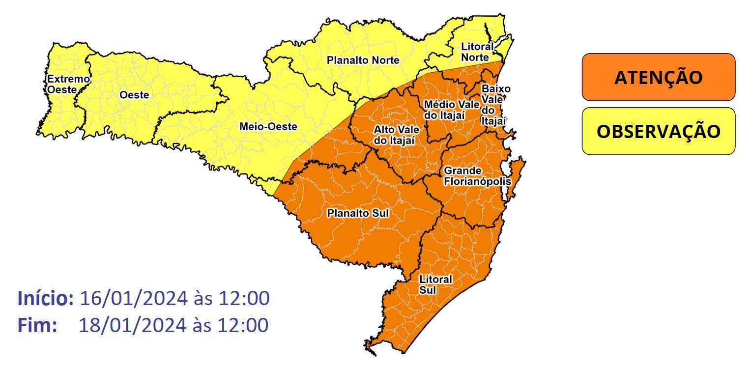 Nas tardes desta terça-feira (16) e quarta-feira (17), a combinação de calor e umidade favorece temporais acompanhados de raios e rajadas de vento em todo o estado de Santa Catarina. Os temporais trazem riscos para ocorrências como destelhamentos, queda de galhos e árvores, danos na rede elétrica, alagamentos e enxurradas pontuais. Este risco é moderado nas áreas em amarelo do mapa, que incluem o Grande Oeste e norte de SC, enquanto as áreas em laranja indicam risco alto, para as regiões do Litoral Sul, Planalto Sul, Grande Florianópolis e em todo o Vale do Itajaí.