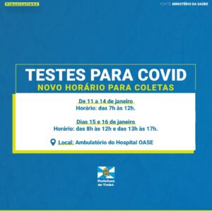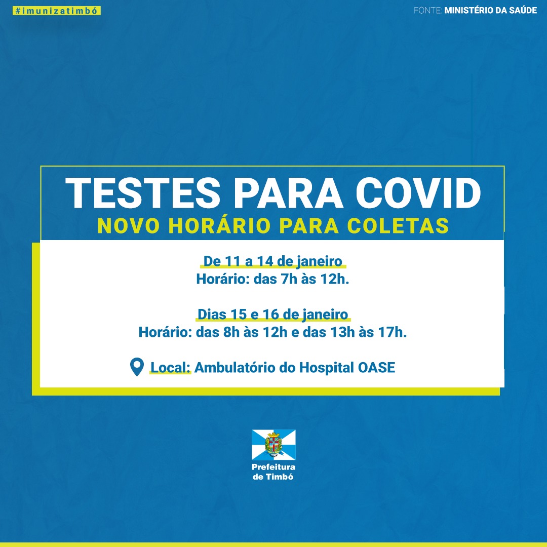 A Secretaria de Saúde de Timbó informa que a partir desta terça-feira, 11 de janeiro, há uma mudança no horário das coletas de exames para Covid-19 no Ambulatório do Hospital Oase, que passam a ser realizados das 7h às 12h.