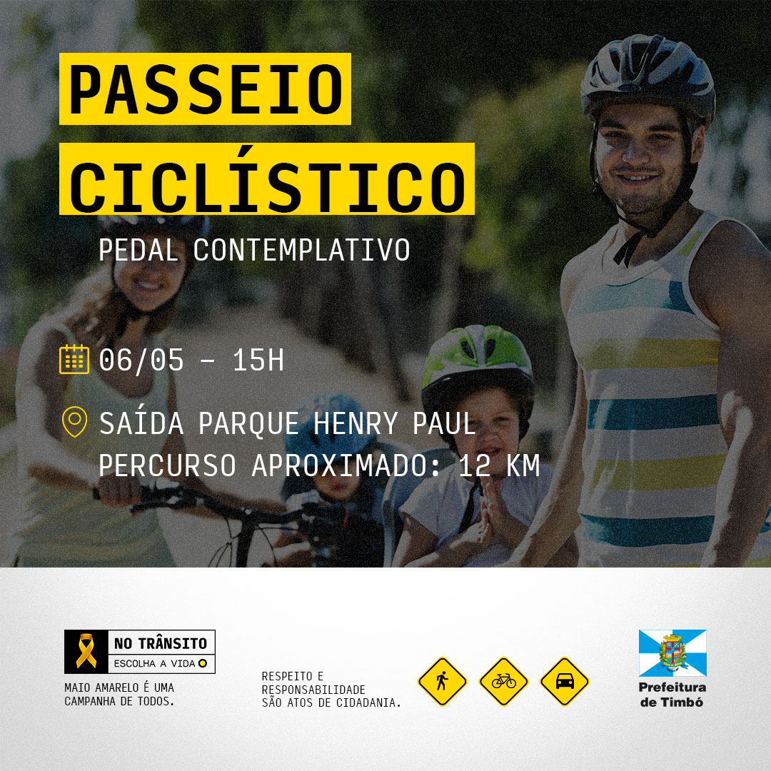 A Prefeitura de Timbó, através da Secretaria de Planejamento e do Departamento Municipal de Trânsito (Demutran), inicia a campanha do Maio Amarelo. A abertura oficial acontece no sábado, dia 06 de maio, com o passeio ciclístico, com saída às 15h do Parque Henry Paul.