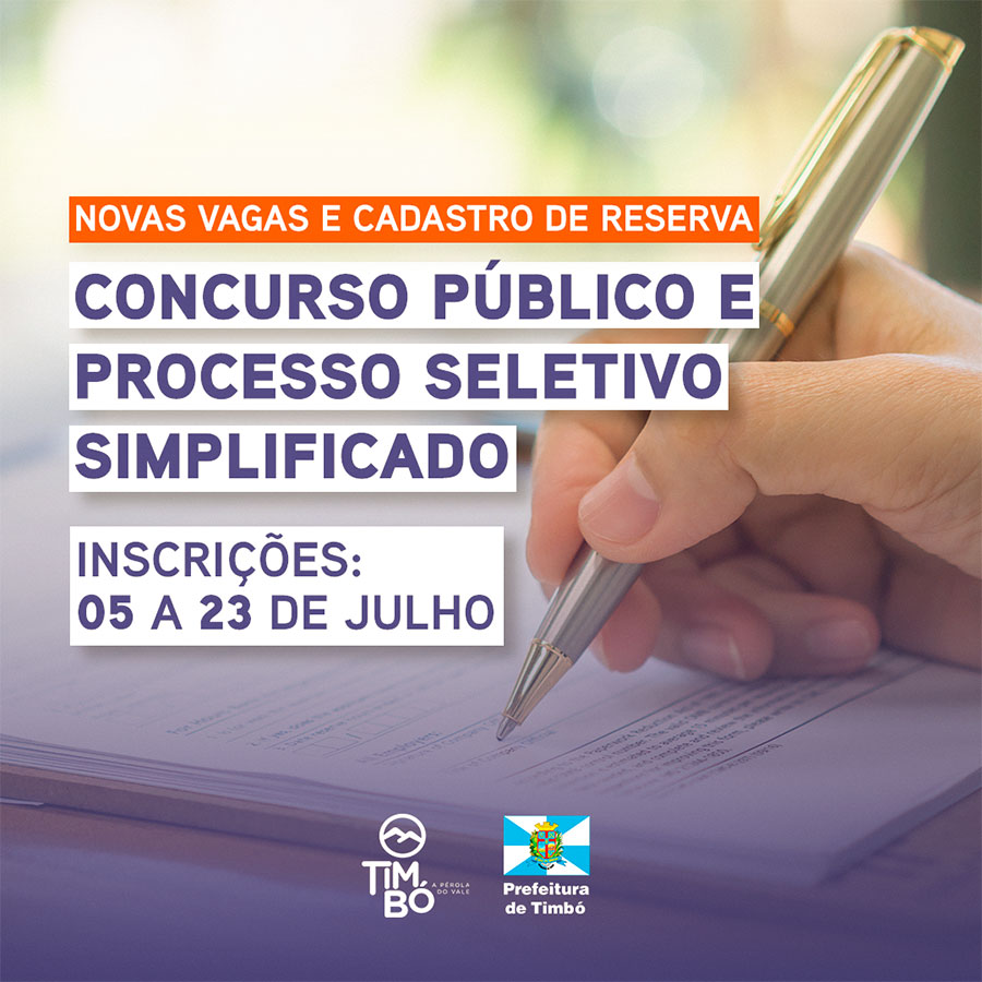 A Prefeitura de Timbó informa que estão abertas, a partir do dia 05 de julho, inscrições para novo concurso público e processo seletivo público simplificado no município.