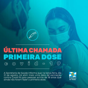 A Secretaria de Saúde informa que na terça-feira, dia 31 de agosto, irá abrir mais uma data de vacinação contra Covid-19 para pessoas acima de 18 anos que ainda não foram fazer a primeira dose.