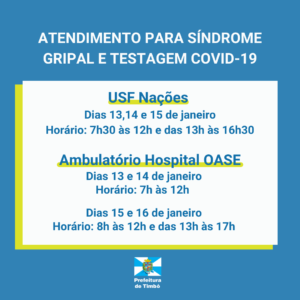 A Secretaria de Saúde informa que, devido à alta demanda nos últimos dias, a partir desta quinta-feira, dia 13 de janeiro, até sábado, dia 15, a USF Nações estará funcionando exclusivamente para atendimento médico para síndrome gripal e testagem de Covid-19. O horário de funcionamento será 7h30 às 12h e das 13h às 16h30.