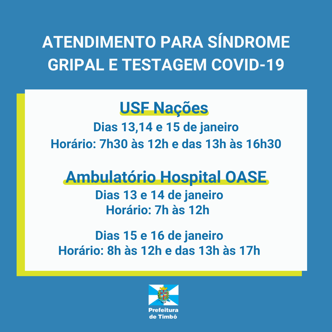 O atendimento médico e testagem no Ambulatório do Hospital Oase também segue funcionando, das 7h às 12h. No próximo final de semana, dias 15 e 16 de janeiro, também estarão sendo coletando testes no Ambulatório do Hospital Oase, das 8h às 12h e das 13h às 17h.