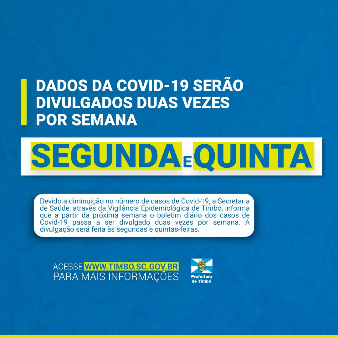 Devido a diminuição no número de casos de Covid-19, a Secretaria de Saúde, através da Vigilância Epidemiológica de Timbó, informa que a partir da próxima semana o boletim diário dos casos de Covid-19 passa a ser divulgado duas vezes por semana. A divulgação será feita às segundas e quintas-feiras.