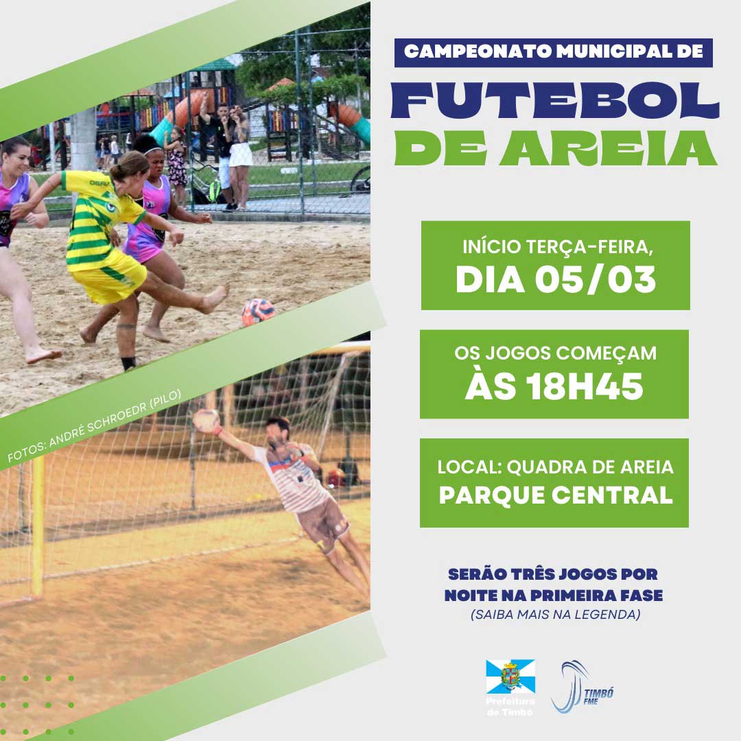 No dia 05 de março, próxima terça-feira, inicia a 12ª edição do Campeonato Municipal de Futebol de Areia, promovido pela Prefeitura de Timbó, através da Fundação Municipal de Esportes (FME) do município.