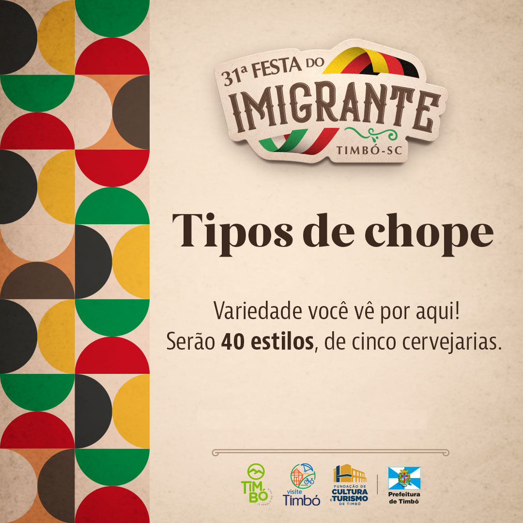 O que não vai faltar na 31ª Festa do Imigrante é chope geladinho. O público vai poder apreciar variados estilos das cinco cervejarias que estarão presentes na Festa, que acontece entre os dias 29 de setembro e 01 de outubro e de 06 a 12 de outubro.
