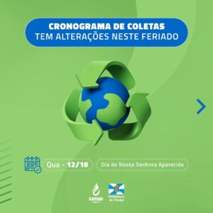 Coleta de Resíduos Recicláveis – NÃO HAVERÁ COLETA. A coleta deste dia será realizada no dia 19 de outubro nos bairros Imigrantes, Nações e Cedrinho Margem Esquerda.