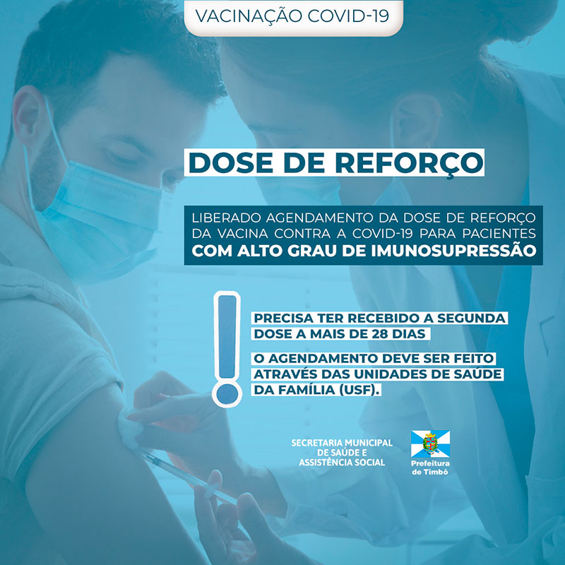 A Secretaria de Saúde de Timbó informa que está liberado para agendamento a dose de reforço da vacina contra Covid-19para pacientes com alto grau de imunossupressão, que receberam a segunda dose há mais de 28 dias.