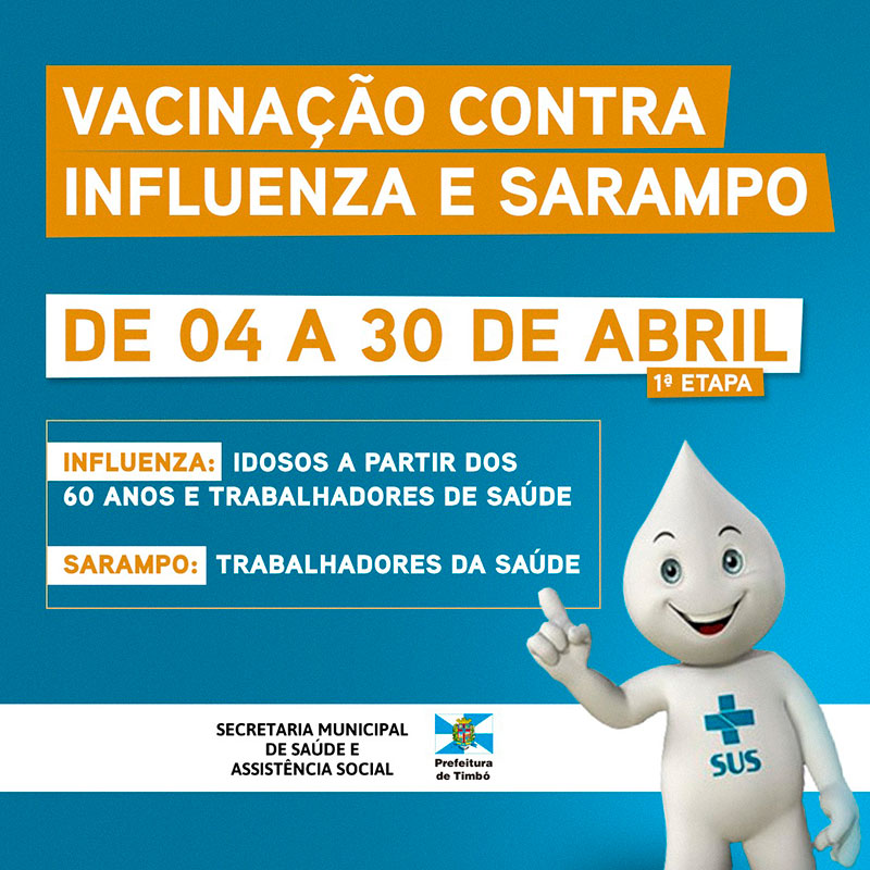 Nesta semana, a Secretaria de Saúde de Timbó iniciou duas importantes campanhas: a Campanha Nacional de Vacinação contra a Influenza e a Campanha Nacional de Vacinação contra o Sarampo. Ambas as campanhas seguem até o dia 03 de junho e serão divididas em duas etapas. Confira o cronograma abaixo e quais os públicos que já podem se vacinar.