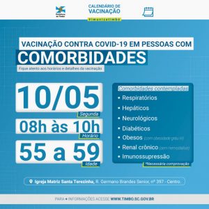 A Secretaria de Saúde informa que na próxima semana irá iniciar a vacinação contra Covid-19 em pessoas com comorbidades. Para respeitar os protocolos de segurança e não gerar aglomeração, foi feita uma divisão entre faixas etárias e comorbidades em diferentes dias e horários.