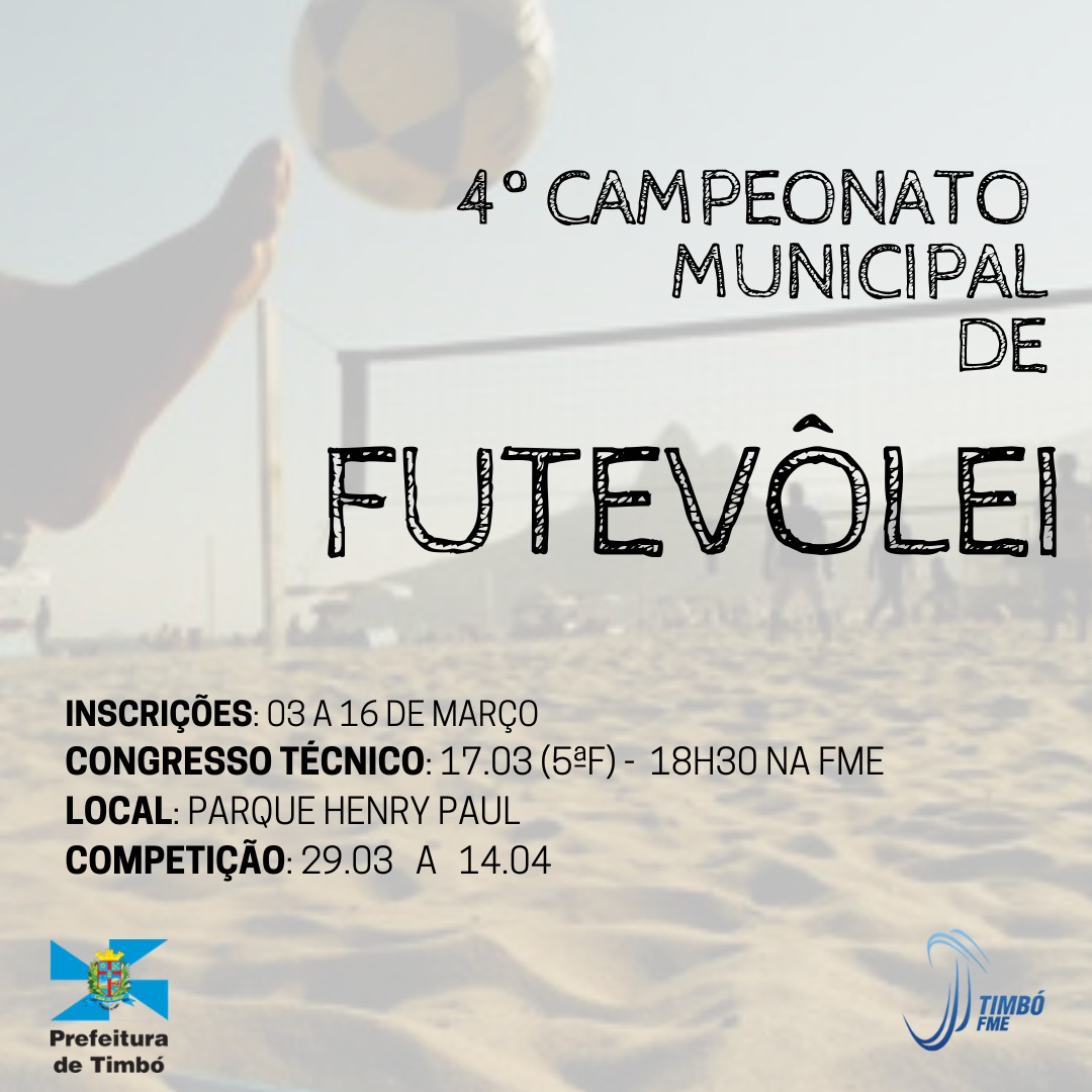 Estão abertas as inscrições para o 4º Campeonato Municipal de Timbó, que segue até 16 de março. O evento acontece entre 29 de março e 14 de abril, na quadra do Parque Henry Paul, e é promovido pela Fundação Municipal de Esportes (FME) de Timbó.