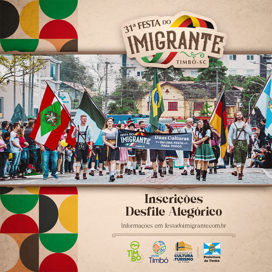 Estão abertas as inscrições para o Desfile Alusivo aos 154 anos de Timbó, que acontece no dia 12 de outubro e faz parte da programação da 31ª Festa do Imigrante.