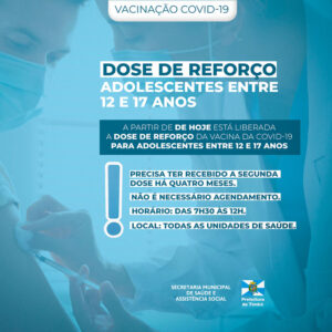 Conforme orientações do Ministério da Saúde, a Secretária de Saúde de Timbó informa que está liberada a dose de reforço da vacina contra Covid-19 para adolescentes entre 12 e 17 anos, que receberam a segunda dose há quatro meses.