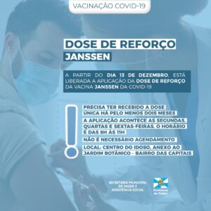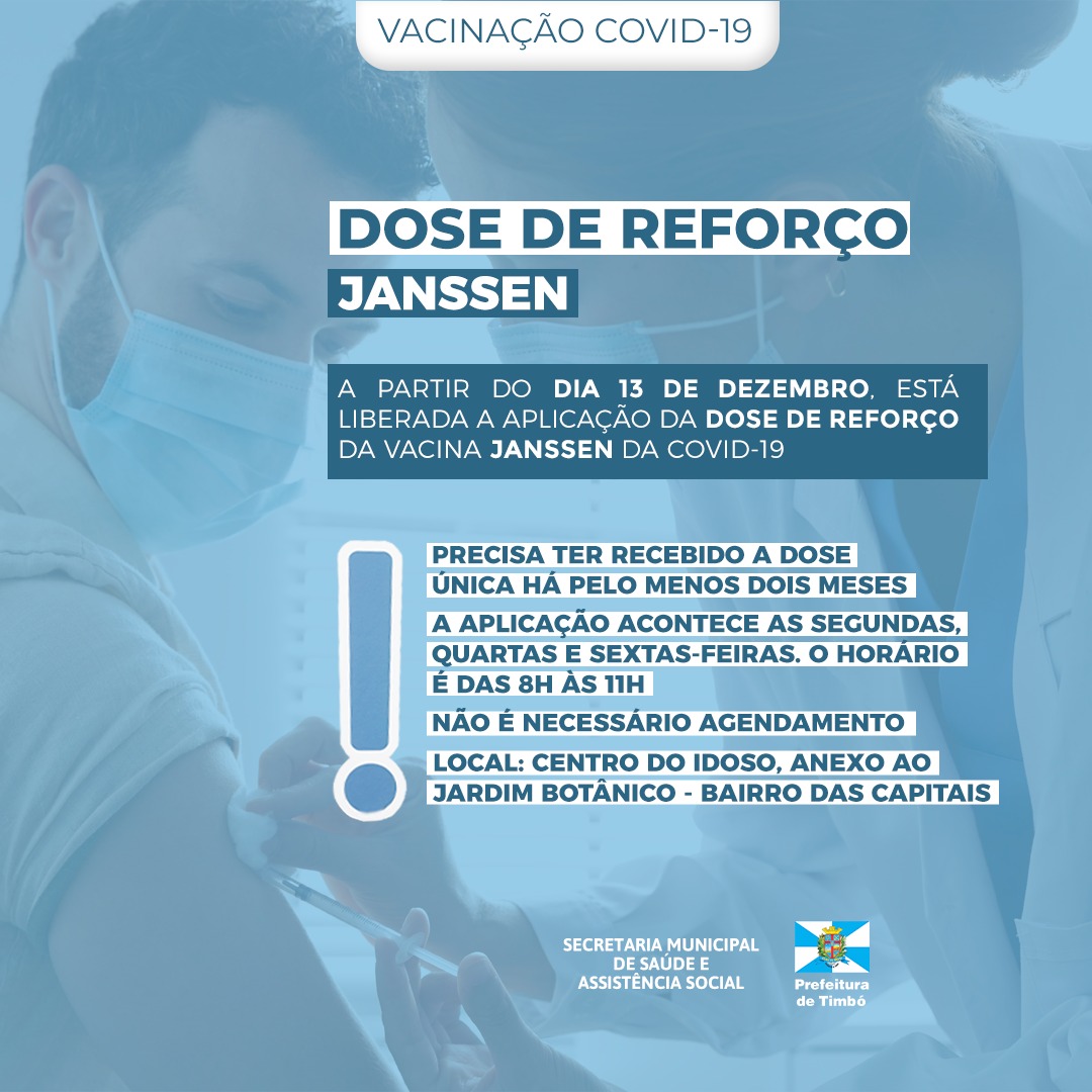 A Secretaria de Saúde de Timbó informa que a partir da próxima segunda-feira, dia 13 de dezembro, está liberada a aplicação da segunda dose (dose de reforço) da vacina Janssen para quem recebeu a dose única há pelo menos dois meses.