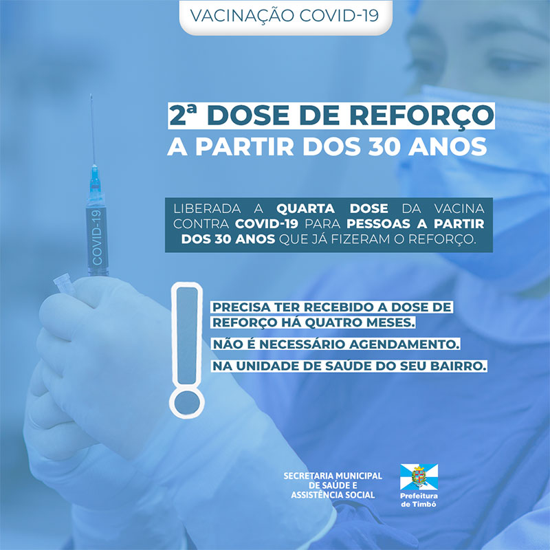 Seguindo as orientações do Ministério da Saúde, a Secretaria de Saúde de Timbó informa que está liberada a quarta dose da vacina contra Covid-19 para pessoas a partir dos 30 anos, que fizeram a dose de reforço (terceira dose) há mais de quatro meses.