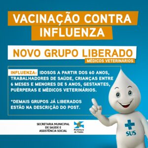 Como parte da Campanha Nacional de Vacinação, a Secretaria de Saúde de Timbó informa que está liberada a aplicação da vacina contra Influenza para médicos veterinários da rede privada.