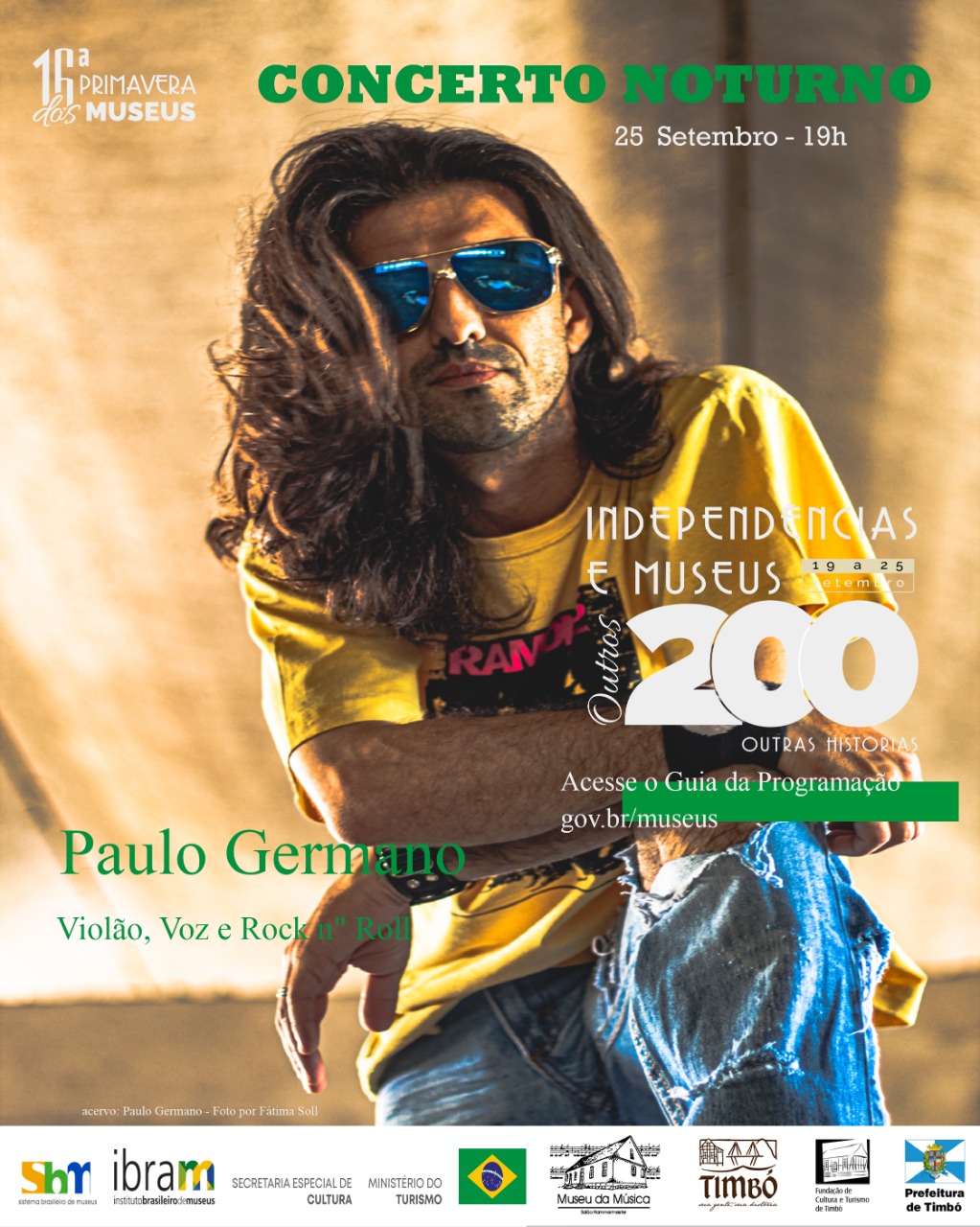 Neste domingo, dia 25, a partir das 19h, acontece no Museu da Música o Concerto Noturno, com Paulo Germano: Violão, Voz e Rock n” Roll. O evento encerra a programação da 16ª Primavera dos Museus em Timbó.