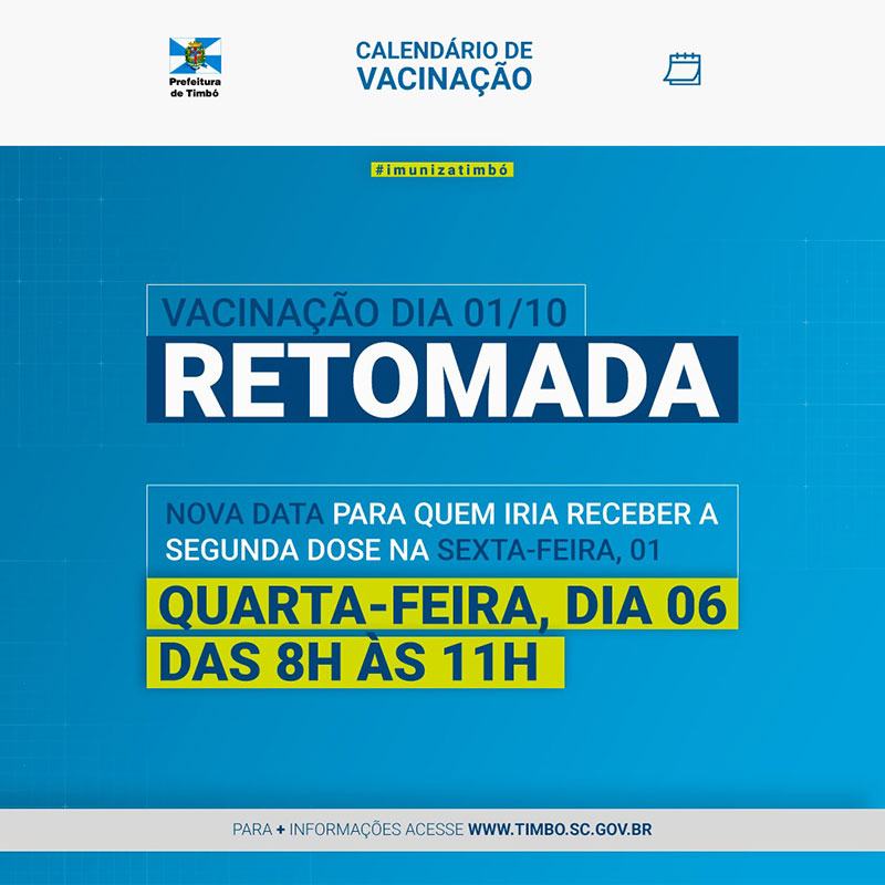 A Secretaria de Saúde de Timbó informa que recebeu as doses da vacina Astrazeneca para aplicar a segunda dose nas pessoas que tomariam nesta sexta-feira, 01 de outubro, que foi cancelada.