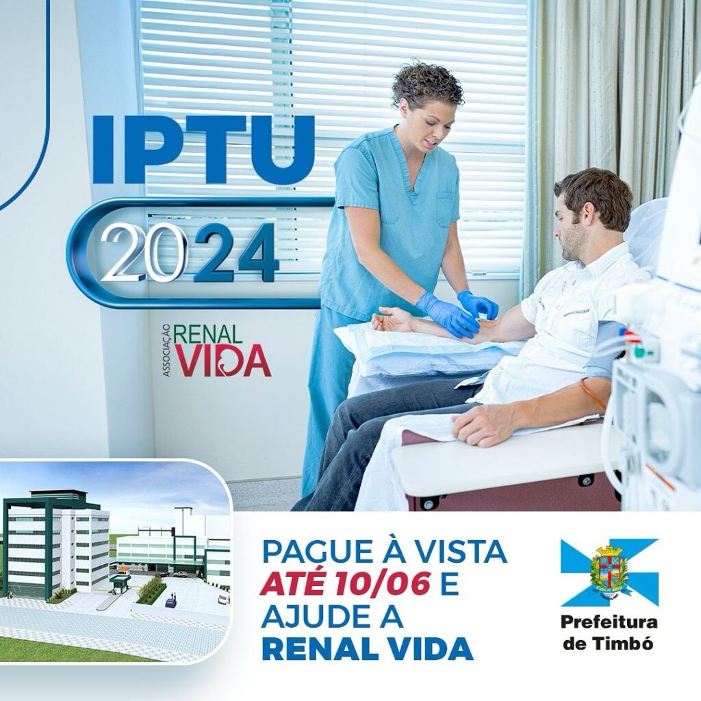 Como nos últimos anos, o IPTU à vista é mais saúde para Timbó. Nos pagamentos à vista, 10% do valor será destinado à Renal Vida. Através desta contribuição, já foram construídas duas UTIs: uma adulta e outra neonatal do Hospital e Maternidade Oase.
