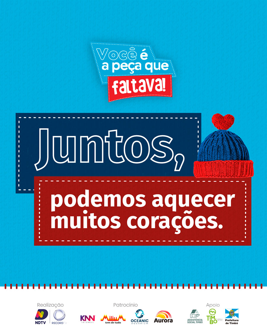A Prefeitura de Timbó está apoiando a Campanha do Agasalho 2023, promovida pela NDTV Record TV. Por isso, haverá um ponto de coleta de casacos, calças, cobertores, edredons e outras roupas de frio na Assistência Social do município, localizada na Av. 7 de Setembro, nº 595 (ao lado do prédio da Prefeitura).