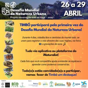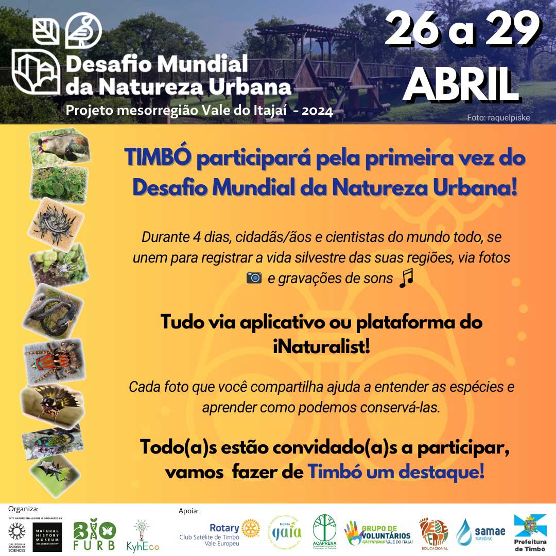 Entre os dias 26 de abril e 5 de maio acontece o Desafio Mundial da Natureza Urbana (e periurbana) de 2024, o maior evento de Ciência Cidadã do planeta. A mesorregião do Vale do Itajaí participará pela segunda vez e Timbó pela primeira vez. A Prefeitura apoia esta ação.