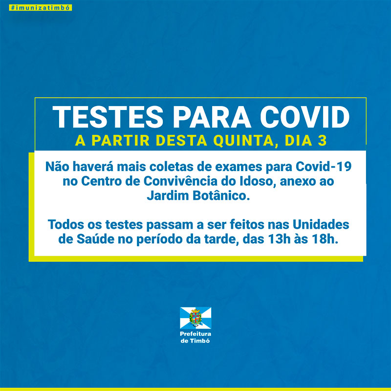 A Secretaria de Saúde de Timbó informa que a partir desta quinta-feira, dia 03 de fevereiro, não haverá mais coletas de exames para Covid-19 no Centro de Convivência do Idoso, anexo ao Jardim Botânico. Todos os testes passam a ser feitos nas Unidades de Saúde no período da tarde, das 13h às 18h.