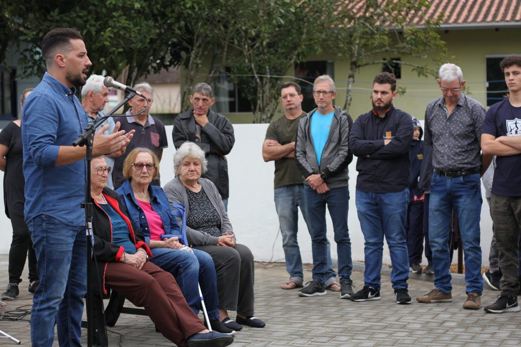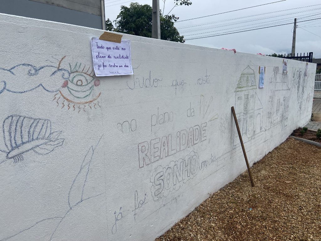 Alunos da Escola Municipal Maurício Germer também estiveram presentes na entrega. Os estudantes da instituição estão realizando a pintura de desenhos e frases nos muros no entorno da praça.
