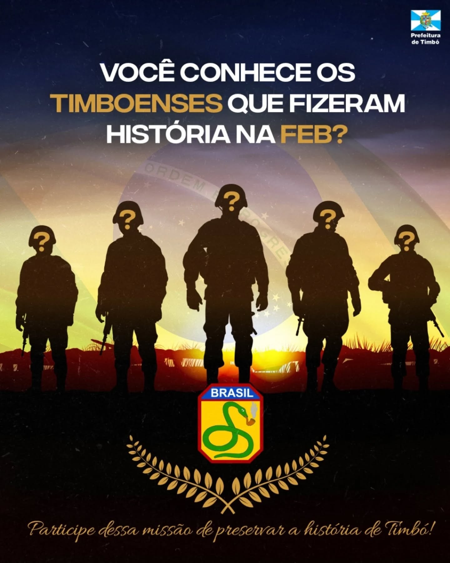 Em Timbó, um grupo de bravos combatentes integrou a Força Expedicionária Brasileira (FEB) e contribuiu para a luta pela liberdade. Com o objetivo de resgatar e registrar memórias e informações sobre esses heróis, a Prefeitura de Timbó está em busca de familiares dos ex-combatentes que representaram a cidade no conflito.
