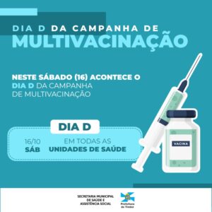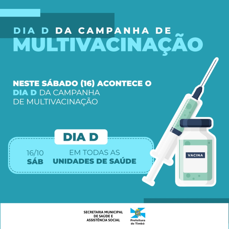 A Secretaria de Saúde de Timbó informa que neste sábado, dia 16 de outubro, acontece o Dia D da Campanha de Multivacinação. Todas as Unidades de Saúde da Família (USFs) do município estarão atendendo, das 8h às 17h, sem fechar para o almoço. Não é preciso realizar agendamento.