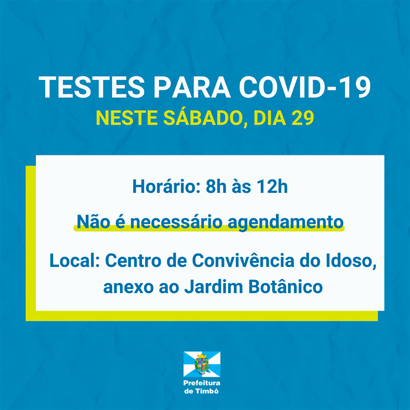 A Secretaria de Saúde de Timbó informa que vai realizar testes de Covid-19 neste sábado, dia 29 de janeiro, das 8h às 12h, sem necessidade de agendamento. O local é o Centro de Convivência do Idoso, anexo ao Jardim Botânico. Assessora: Raquel Piske/Ascom PMT Arte: PMT