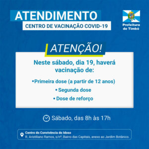A Secretaria de Saúde de Timbó informa que o Centro de Vacinação estará funcionando neste sábado, dia 19 de fevereiro, para aplicação da vacina contra Covid-19 em adolescentes e adultos. O horário é das 8h às 17h, no Centro de Convivência do Idoso, anexo ao Jardim Botânico. Não é necessário agendamento.