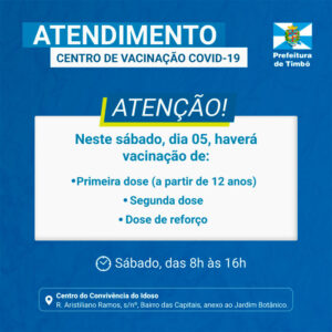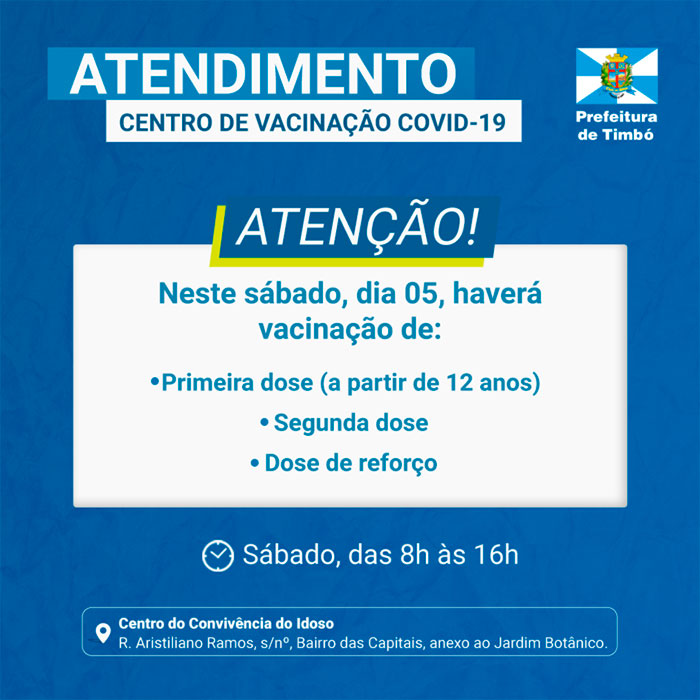 A Secretaria de Saúde de Timbó informa que o Centro de Vacinação estará funcionando neste sábado, dia 05 de fevereiro, para aplicação da vacina contra Covid-19 em adolescentes e adultos. O horário é das 8h às 16h, no Centro de Convivência do Idoso, anexo ao Jardim Botânico.