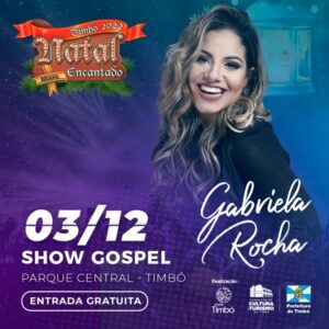 O Natal Mais Encantado de Timbó vai receber neste sábado, dia 03 de dezembro, a cantora gospel Gabriela Rocha. O show acontece no Parque Central, a partir das 19h, com as apresentações da Banda Revolução e o Projeto Avante.
