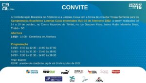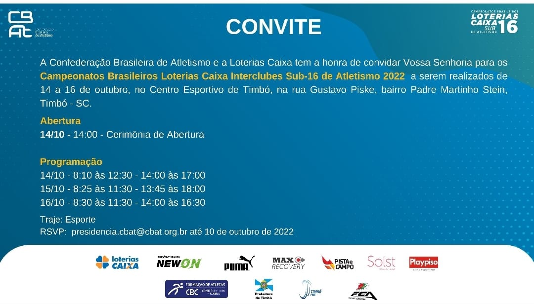 Entre os dias 14 a 16 de outubro, Timbó vai sediar o Campeonato Brasileiro Loterias Caixa Interclubes Sub-16 de Atletismo 2022. O evento é organizado pela Confederação Brasileira de Atletismo e a Loterias Caixa e conta com o apoio da Prefeitura de Timbó, através da Fundação Municipal de Esportes (FME Timbó).
