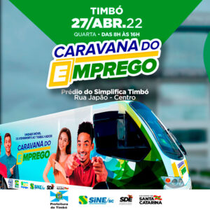 No dia 27 de abril Timbó recebe a Caravana do Emprego, do Sistema Nacional do Emprego (Sine), com apoio da Prefeitura de Timbó. A ação acontece no Simplifica Timbó, que fica na Rua Japão, número 408, das 8h às 16h.