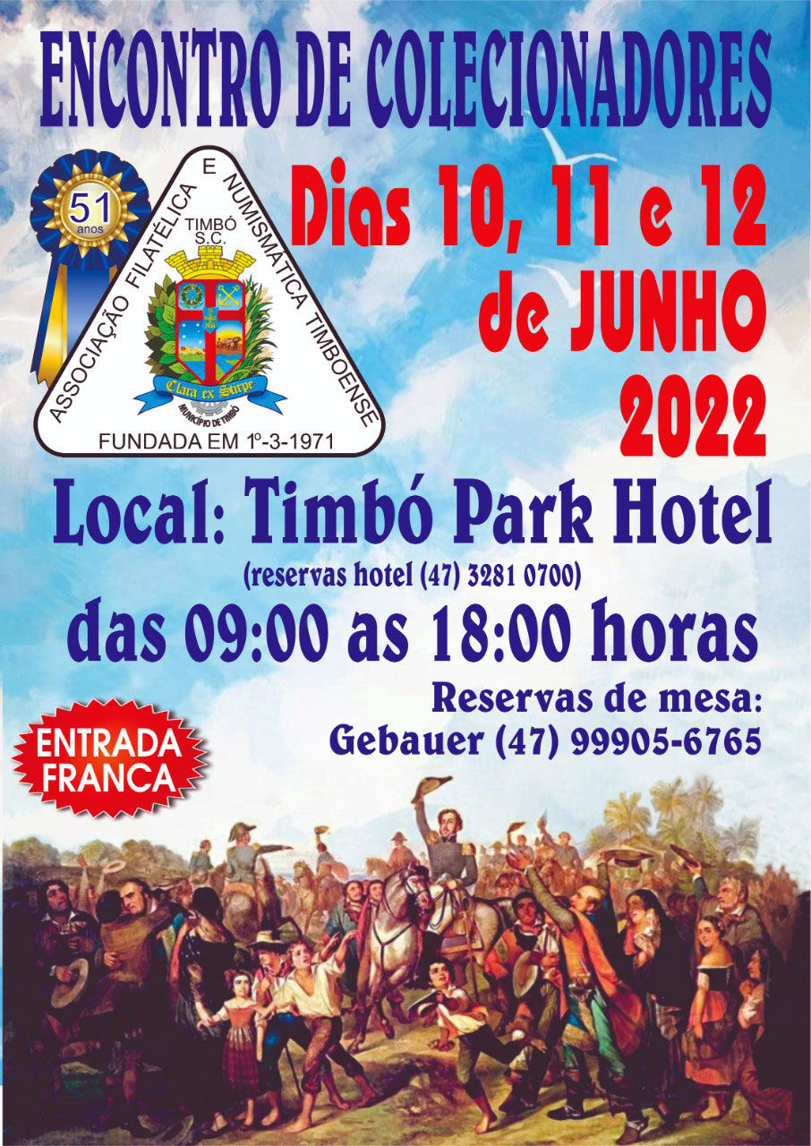 Nos três dias, o encontro acontece das 9h às 18h, no Timbó Park Hotel, com entrada gratuita. São esperados colecionadores de selos, moedas, cédulas, cartões telefônicos e antiguidades de todo o país.