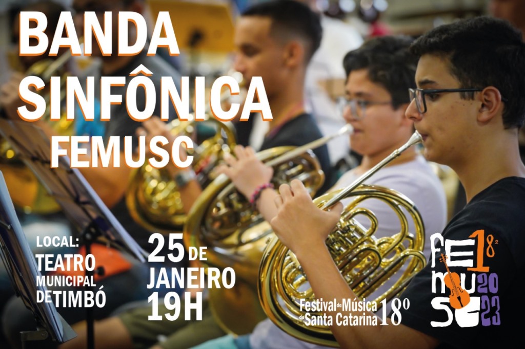 Nesta quarta-feira, dia 25 de janeiro, às 19h, Timbó recebe no Teatro Municipal, a Banda Sinfônica do Festival Internacional de Música de Santa Catarina (FEMUSC), que está na sua 18ª edição e é o maior festival-escola da América Latina.
