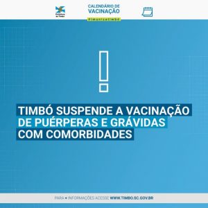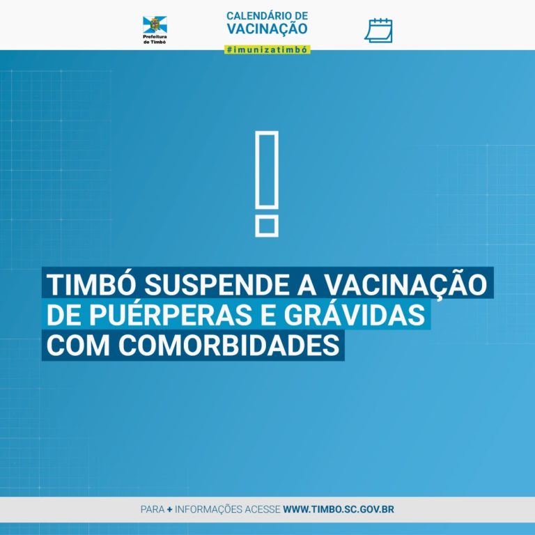A Secretaria de Saúde de Timbó informa que a vacinação contra Covid-19 de grávidas e puérperas com comorbidades está suspensa (grávidas sem comorbidades ainda não estavam sendo vacinadas em Timbó). Segundo o departamento de Vigilância Epidemiológica do município, esta é uma orientação feita hoje pela Secretaria de Estado da Saúde (SES), em virtude do comunicado emitido pela Agência Nacional de Vigilância Sanitária (Anvisa) na noite desta segunda feira (10).