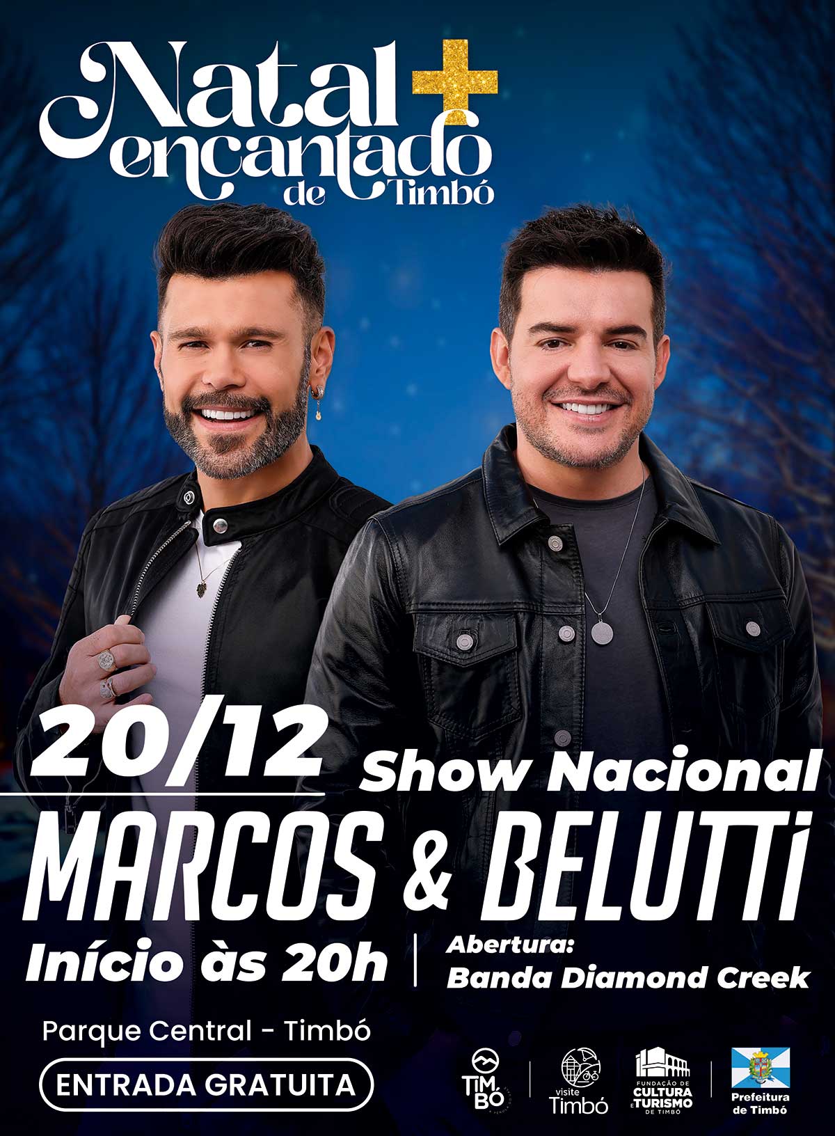 Um dos momentos sempre muito aguardados é o show nacional na programação do Natal Mais Encantado de Timbó. Neste ano, quem agitará o palco do Parque Central será a dupla sertaneja Marcos e Belutti.