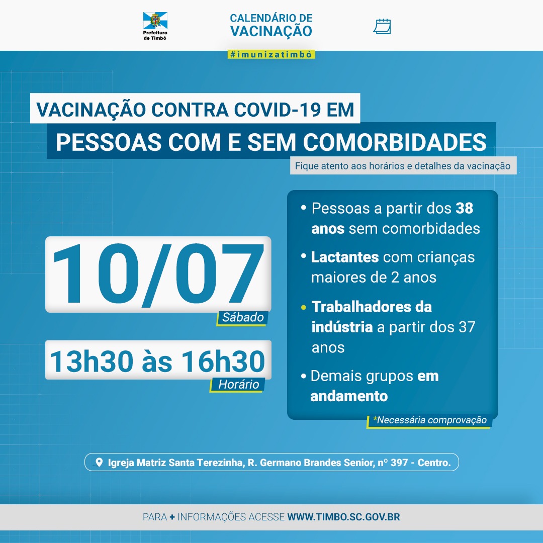 A Secretaria de Saúde informa que neste sábado, dia 10 de julho, irá vacinar contra Covid-19 pessoas a partir dos 38 anos, trabalhadores da indústria a partir dos 37 anos e lactantes com crianças maiores de dois anos.