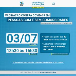 A Secretaria de Saúde informa que neste sábado, dia 03 de julho, pessoas a partir dos 42 anos e lactantes com crianças entre 1 ano a menores de 2 anos serão vacinadas contra a Covid-19.