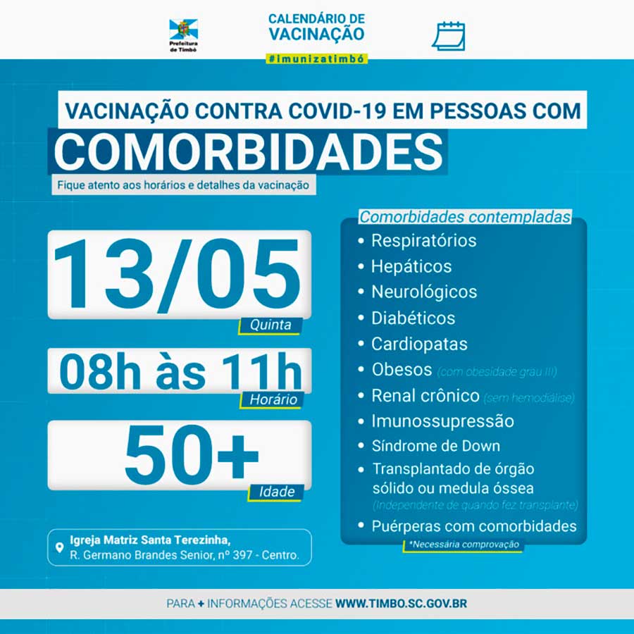A Secretaria de Saúde informa que nesta quinta-feira, dia 13, irá vacinar contra Covid-19 pessoas a partir dos 50 anos com comorbidades. A vacinação ocorre das 8h às 11h.