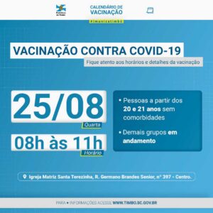 A Secretaria de Saúde informa que na quinta-feira, dia 25 de agosto, irá vacinar contra Covid-19 pessoas a partir dos 20 e 21 anos.